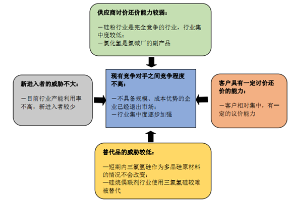 用波特五力分析模型对我国三氯氢硅行业的竞争特性进行分析的结果如下: