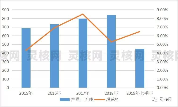 2015-2019年中国胶粘剂行业产量统计及增速对比